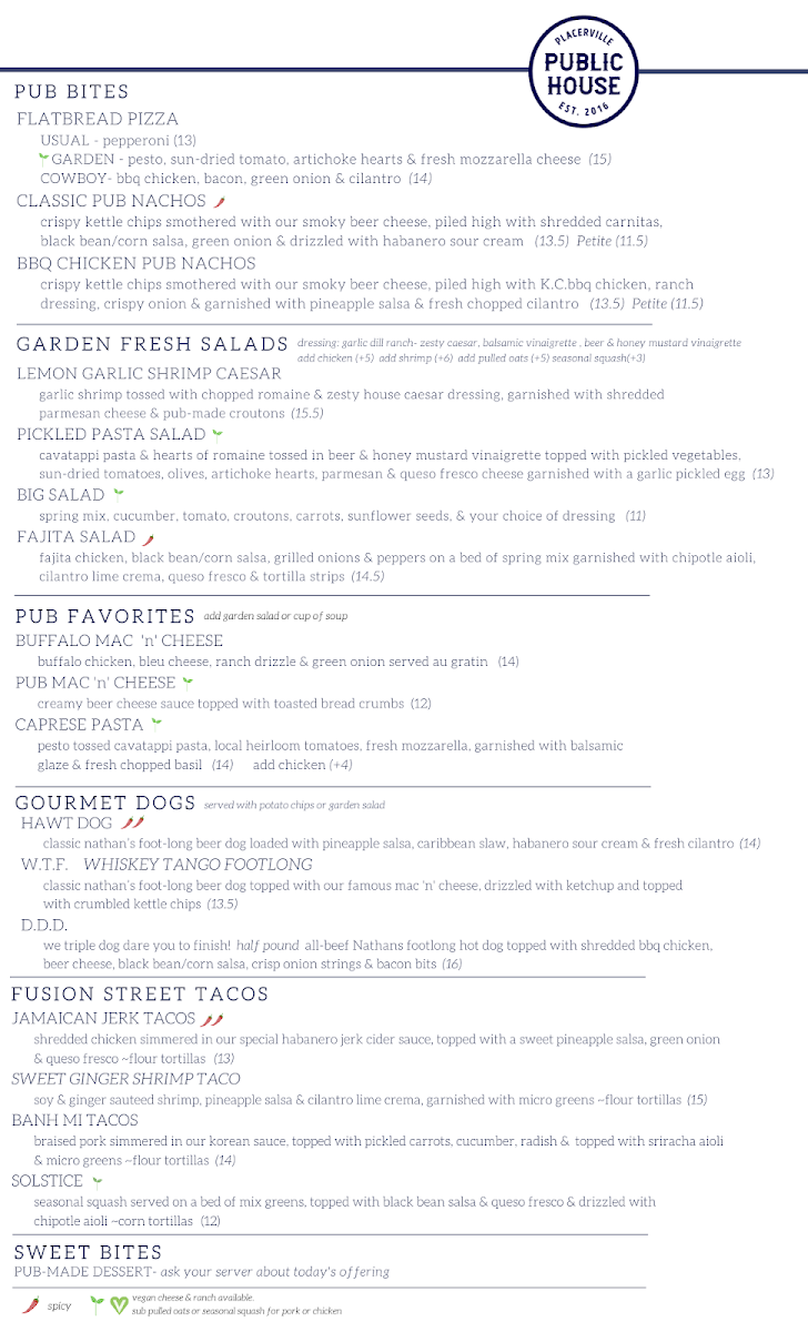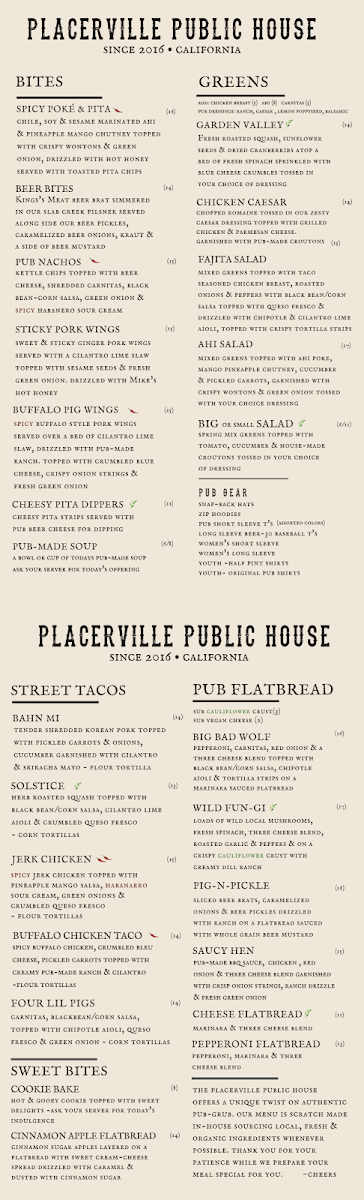 If you’re in the mood for great food and a cozy, laid-back atmosphere, look no further than Placerville Public House - Family Restaurant & Pub Menu. Nestled at 305 Main St in Placerville, CA, this spot is perfect for families and friends to gather, enjoy a meal, and unwind. Whether you’re craving a juicy burger, fresh seafood, or a hearty comfort dish, the menu has something for everyone. From light bites to filling entrees, every dish is crafted with care using fresh ingredients, making it a go-to place for both a quick lunch and a relaxed dinner. With a full selection of drinks at the bar and plenty of options for the little ones, you’ll feel right at home while you savor every bite. Whether it’s a family night out or a casual hangout with friends, this restaurant offers a warm, welcoming environment for all.